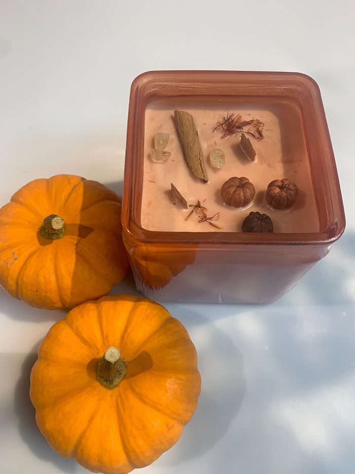 This handmade candle is a perfect gift to present your friends or family members. Its scent is delicious and reminds of a freshly baked apple pie with a hint of cinnamon, clove and a little bit of sweet orange. We topped it off with the obvious elements for this time of the year – tiny pumpkins and cinnamon bark. We also infused it with Citrine gemstone, believed to promote good health and self-esteem; creativity and generosity. It is hand-poured in a rustic, burnt orange coloured glass container. Our choice of double wood wicks finishes off the seasonal look of this candle, not to mention the crackling sound that makes when burning, which is so cool. It makes a perfect gift on its own or paired with a seasonal flower arrangement.