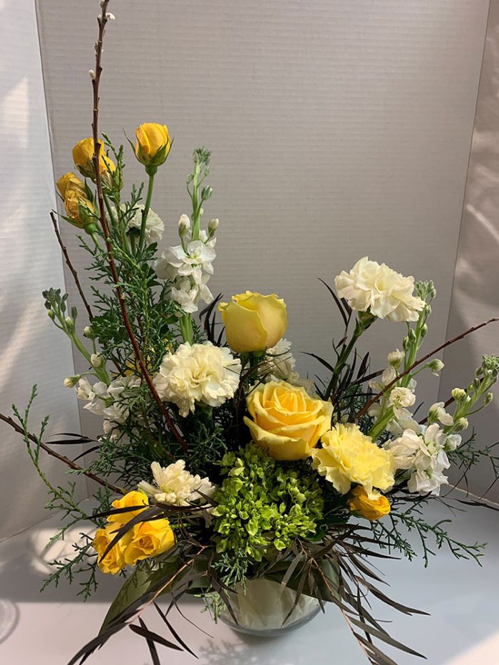 Fusion of flower blooms and premium foliage, this untraditional floral piece is a low maintenance. Floral elements are arranged in a container that only needs to be filled with water daily – no need to cut stems or change water. It is modern and wild, and simply beautiful.
